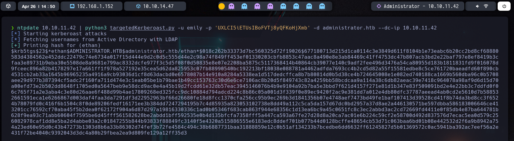 > Primero sincronizamos la hora con el servidor para evitar errores de autenticación, y luego lanzan un ataque **Kerberoast** contra el usuario `emily` en el dominio `administrator.htb`, usando su contraseña conocida, apuntando al servidor `10.10.11.42`.